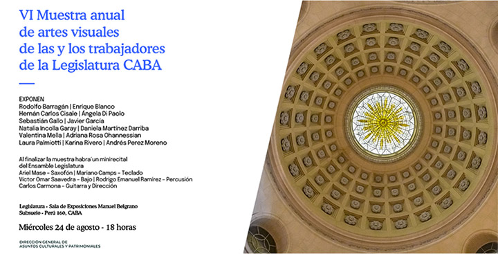 La VI Muestra Anual de Artes Visuales de Trabajadores de la Legislatura CABA se inaugura el miércoles 24 de agosto a las 18 horas en Perú 160, subsuelo Sala de Exposiciones. Podrá visitarse del 25 al 7 de septiembre de lunes a viernes de 10 a 19 horas, con entrada libre y gratuita.