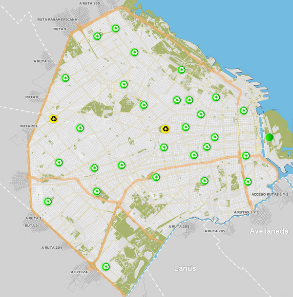 A éstos, se suman los dos Puntos Verdes Especiales de la Agencia de Protección Ambiental (APrA) que ya se encuentran en marcha en Parque Centenario (Av. Patricias Argentinas y Av. Roentgen) y en la Plaza Arenales (Mercedes y Nueva York, Villa Devoto), y en los que además de plásticos, cartón, papel, metal y vidrios también se puede llevar telgopor, aparatos de informática y pequeños electrodomésticos.