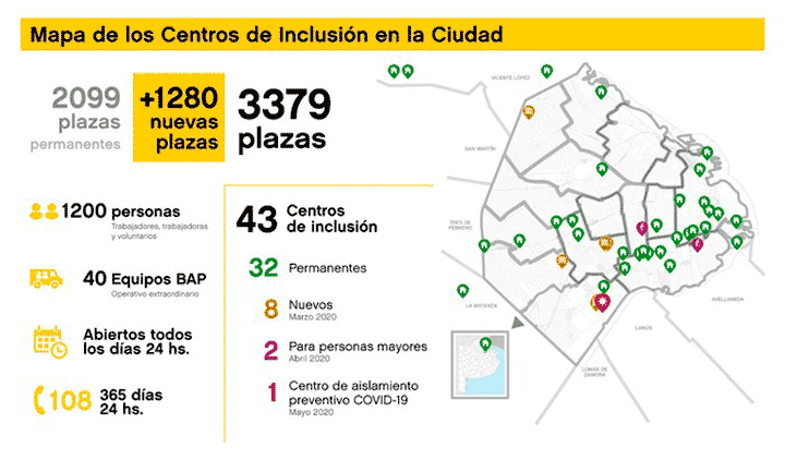 La Ciudad ha realizado un esfuerzo sin precedentes al inicio de la cuarentena, abriendo 8 nuevos Centros de Inclusión en polideportivos incorporando 900 camas al sistema.